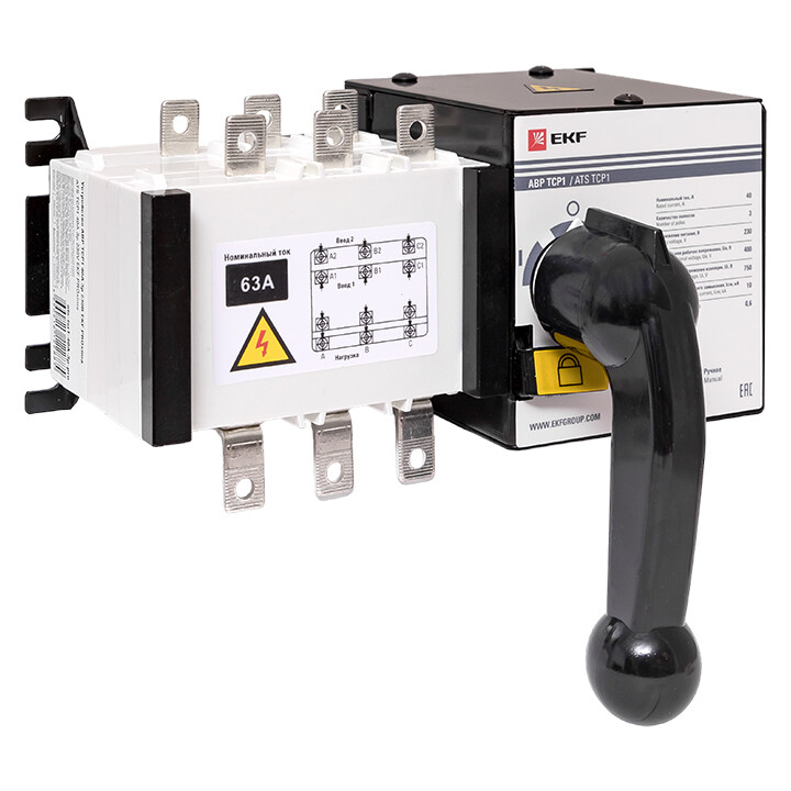 Устройство АВР ТСP1 EKF PROxima предназначено для обеспечения резервным электроснабжением нагрузки, подключенной к системе электроснабжения, имеющей основной и резервный вводы. Устройство АВР автоматически подключает резервную линию питания в случае пропадания напряжения на основной линии. Конструкция и принцип действия: Устройство АВР ТСP1 EKF PROxima выполнено в виде моноблока и состоит из контактного блока и блока управления. На блоке управления имеется рычаг ручного переключения, замковый механизм перевода в ручной или автоматический режимы управления и запорный механизм, обеспечивающий блокировку переключения устройства АВР. Корпус контактного блока выполнен из термостойкой АВС пластмассы. Механизм переключения обеспечивает перемещение контактных групп мостикового типа, которые замыкают цепи или основной линии, или резервной линии, также предусмотрено положение, когда обе линии отключены. В металлическом корпусе блока управления смонтирован электромотор приводной механизм и реле управления. Реле управления запитано от линии L3 основного ввода. При наличии напряжения на линии L3 основного ввода реле управления подает напряжение на электромотор, который обеспечивает замыкание контактных групп основного ввода и отключается концевым выключателем после замыкания главных контактов. Попытка ручного переключения ввода приведет к включению электромотора управления, который вернет питание от основного ввода. При пропадании напряжения на основном вводе реле управления подаст напряжение от резервного ввода на электромотор управления. Работа устройства АВР от резервного ввода аналогична работе устройства АВР от основного ввода. При появлении напряжения на основном вводе устройство АВР автоматически переключится на основной ввод.