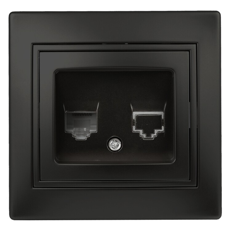 Розетка RJ45 серии Intro Plano скрытой установки цвет антрацит 1-303-05. Номинальные характеристики . Розетка выполнена из термопласта, укомплектована одноместной рамкой. Для установки 2-х и более устройств в несколько подрозетников в ряд дополнительно используются многоместные рамки: 2-х постовая - 1-502-хх, 3-х постовая 1-503-хх, 4-х постовая - 1-504-хх (где хх - цветовой код: 01 - белый, 02 - слоновая кость, 03 - алюминий, 04 - шампань, 05 - антрацит, 10 - венге, 11 - сосна).