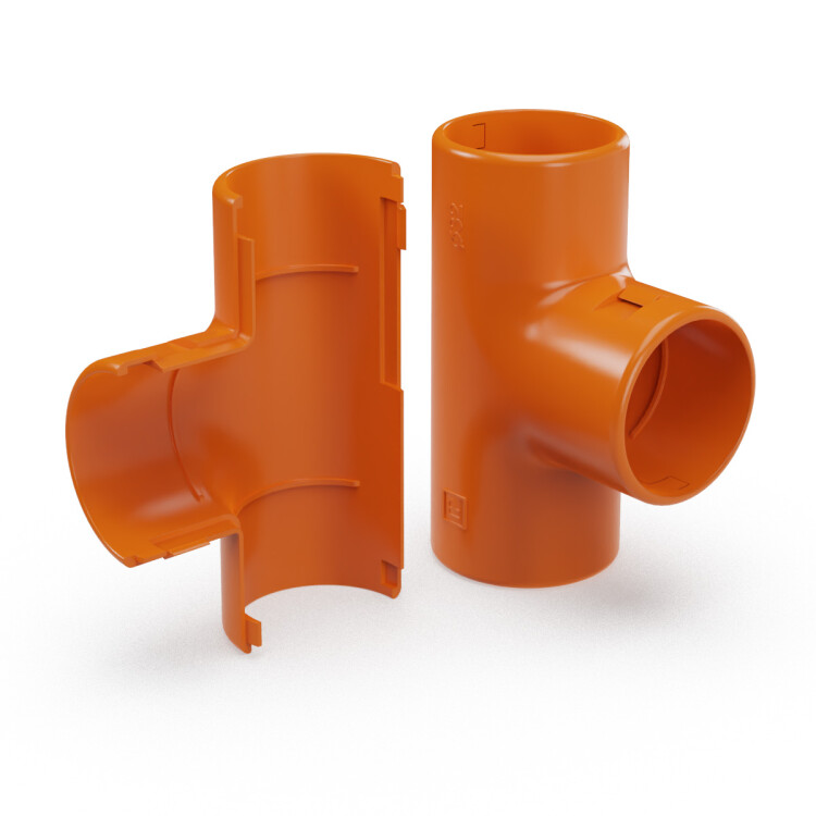 Предназначен для соединения гофрированных труб или гладких труб из пластика, образуя Т-образное ответвление, что позволяет придать более эстетичный внешний вид местам соединения. Состоит из двух частей соединяющихся друг с другом. Благодаря разъёмному корпусу, имеет возможность установки на уже смонтированную трассу. Ассортимент дополняют изделия оранжевого цвета для использования в комплекте с гладкими и гофрированными трубами в таком же цвете.
