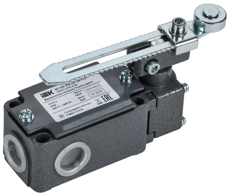 Выключатели путевые ВП15К товарного знака IEK (далее — выключатель) предназначены для коммутации электрических цепей управления переменного и постоянного тока под воздействием управляющих упоров в определенных точках пути контролируемого объекта. Они срабатывают при достижении механизмами заданных точек, размыкая или переключая электрические цепи управления. Эти выключатели играют ключевую роль в безопасности, предотвращая аварии и защищая оборудование от повреждений из-за перегрузок или нештатных ситуаций. Их применяют в лифтах, конвейерах, станках, автоматических воротах и других системах, где важен четкий контроль движения.