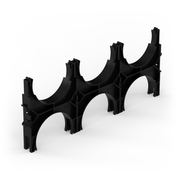 Кластеры для двустенных труб двухсторонние предназначены для упорядоченной прокладки двустенных гофрированных, жестких, дренажных и ливневых труб c фиксированным расстоянием между ними при блочном монтаже. С их помощью можно осуществлять монтаж на склонах с большим градусом уклона. С целью облегчения и ускорения групповой прокладки труб кластеры одного типоразмера теперь доступны к продаж е уже соединенные между собой по горизонтали.