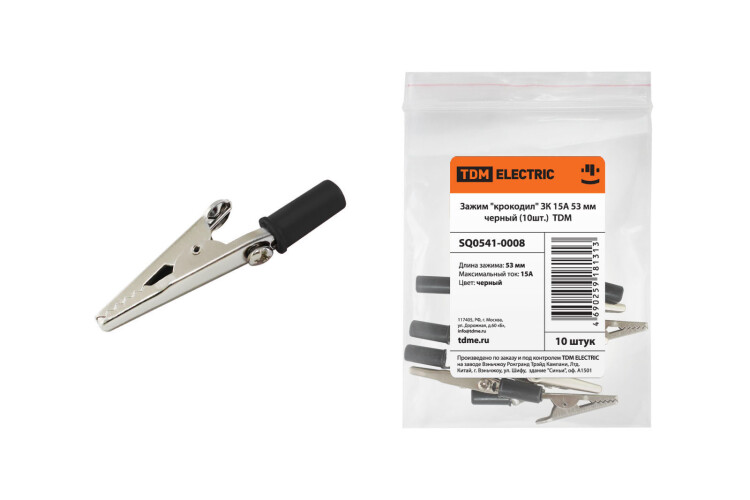 Зажим "крокодил" 15А 53мм черный (10шт) TDM предназначен для фиксации или временного соединения проводников Зажим примененяется при диагностике, ремонте и пусконаладке электрических и электронных систем для временного подсоединения к существующей аппаратуре измерительных приборов, шунтов, временных обходных и тестовых соединений. Материалы: - фигурные детали (челюсти) изготавливаются штамповкой из никелированного листового металла - изоляция зажима выполнена из пвх Конструкция зижима: две фигурные детали с зубцами, соединяются в середине специальным штифтом. К одной из деталей может быть присоединен провод. Сжатие «челюстей» обеспечивается пружиной, вставленной с другой стороны штифта. Преимущества зажима «крокодил»: - зажим «крокодил» незаменим для временного соединения проводов или их фиксации - удобен и прост в эксплуатации