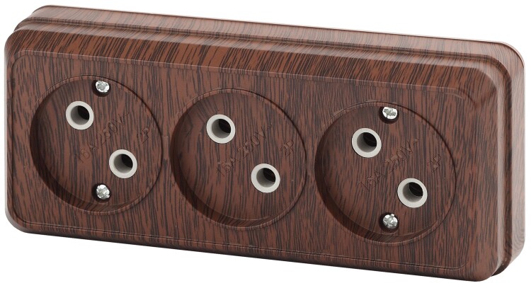 <p>Розетка тройная 3-я серии Intro Quadro открытой установки цвет венге 2-205-10. Номинальные характеристики 16А 250В. Розетка выполнена из термопласта, стали и латуни, оснащёна винтовыми зажимами.</p>