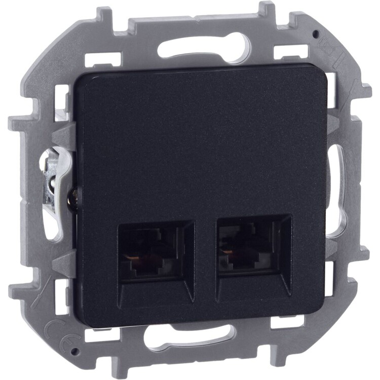 Розетка компьютерная двойная для скрытого монтажа Inspiria, 2 разъема RJ45 категория 5е UTP, цвет "Антрацит". Предназначена для быстрого подключения персональных компьютеров, принтеров, роутеров и другого оборудования к информационным сетям категории 5е со скоростью передачи данных до 1000 Мбит/с. Возможно прямое подключение 2 устройств и 2 кабелей.