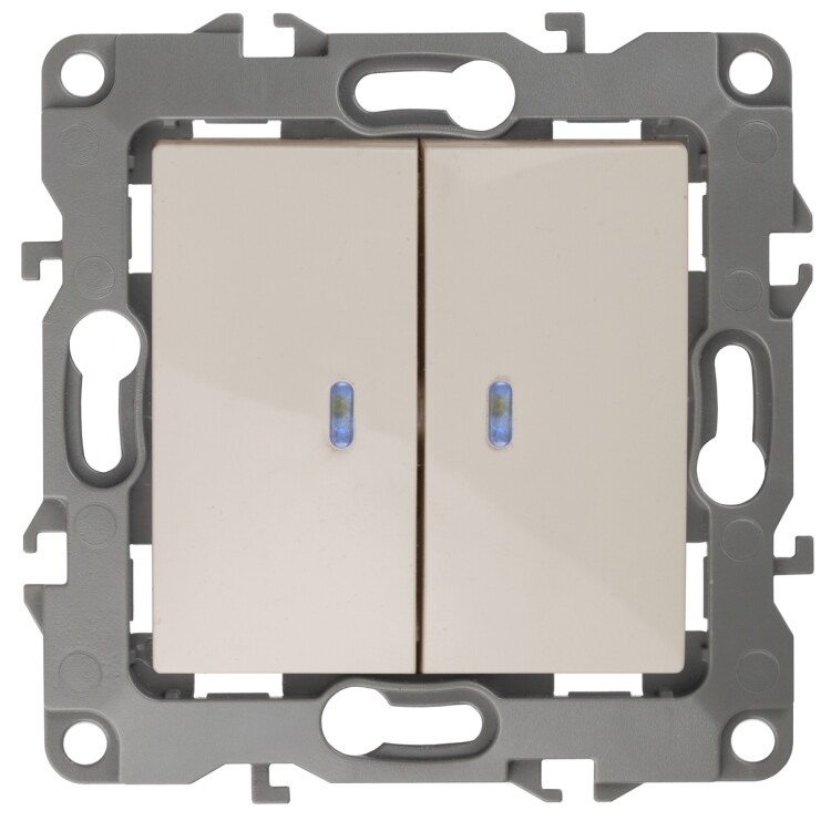 Выключатель 2-клавишный с подсветкой серии Эра 12 скрыт.установки механизм цвет слоновая кость 12-1105-02. Номинальные характеристики 10А 250 . Сделан из поликарбоната, оснащёно автоматическими клеммами для быстрй и надёжной фиксации жил кабеля в механиме. Парные клеммы обеспечивают соединение шлейфом. Монтаж в подрозетник производится и на лапки, и на винты. Рамки приобретаются отдельно. Рамки Эра 12: 1 пост 12-5001-хх, 2 поста 12-5002-хх, 3 поста 12-5003-хх, 4 поста 12-5004-хх, 5 постов 12-5005-хх. Рамки Эра 12 Сатин: 1 пост 12-5101-хх, 2 поста 12-5102-хх, 3 поста 12-5103-хх, 4 поста 12-5104-хх, 5 постов - 12-5105-хх (хх - код цвета: 01-белый, 02-слоновая кость, 03-алюминий, 04-шампань, 05-антрацит, 06-чёрный, 07-ольха(белёный дуб-сатин), 08-вишня, 09-дуб, 10-венге, 11-сосна, 21-жёлтый, 22-оранжевый, 23-красный, 24-охра, 25-бордо, 26-лайм, 27-зелёный, 28-голубой, 29-синий).