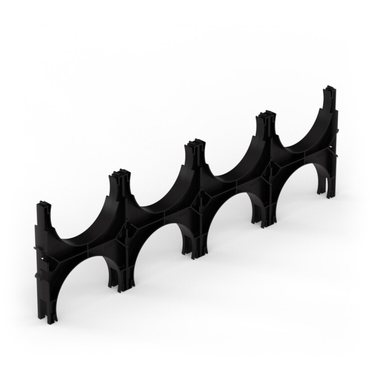 Кластеры для двустенных труб двухсторонние предназначены для упорядоченной прокладки двустенных гофрированных, жестких, дренажных и ливневых труб c фиксированным расстоянием между ними при блочном монтаже. С их помощью можно осуществлять монтаж на склонах с большим градусом уклона. С целью облегчения и ускорения групповой прокладки труб кластеры одного типоразмера теперь доступны к продаж е уже соединенные между собой по горизонтали.