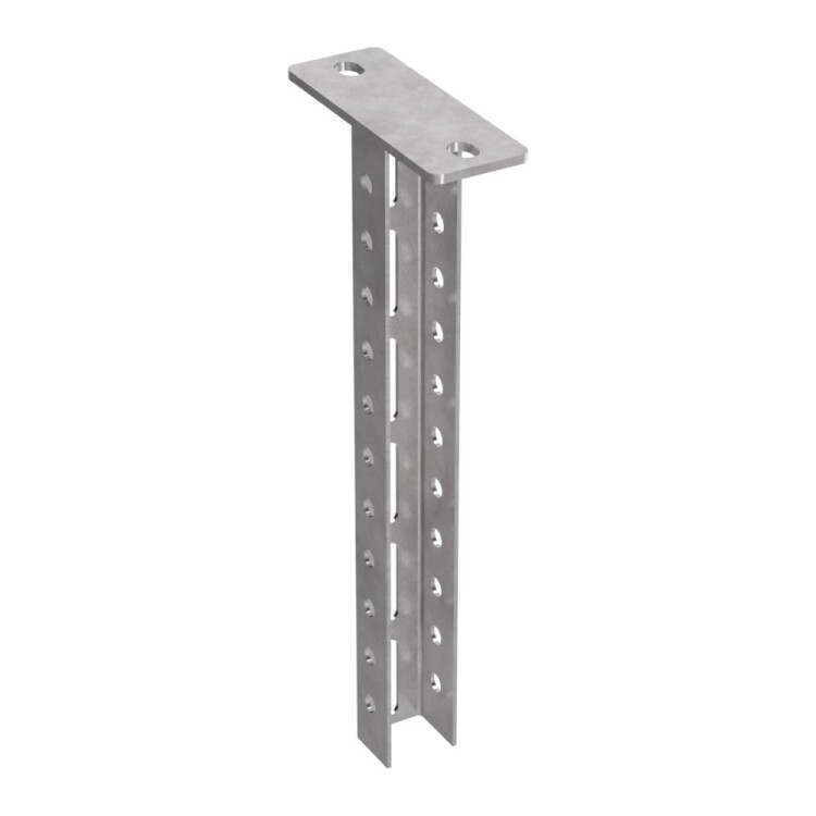 Система подвесов изготовленных из стали с защитным покрытием по методу Сендзимира – это изделия, на которых защитное цинковое покрытие было нанесено на листовую сталь перед изготовлением. Толщина защитного покрытия варьируется от 10 до 22мкм. Климатическое исполнение изделий УХЛ2, что предусматривают эксплуатацию в помещении и под навесом, при температуре эксплуатации от -80 до +150°С. Консоль универсальная П-образная (КУП) - это опорное изделие, состоящее из П-образного профиля и прямоугольного основания, сваренных между собой. П - образный профиль и прямоугольное основание из стальной пластины. Позволяют крепить стойку к потолку. Разные исполнения по длине данного изделия дают возможность подбирать оптимальный вариант для формирования нужных конструкций. Вдоль всего профиля имеется перфорация по трем плоскостям, обеспечивающая удобный монтаж стоечного кронштейна и двухстороннего стоечного кронштейна на необходимой вам высоте.