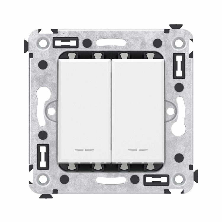 Задача двухклавишного переключателя - управление двумя контурами освещения из двух точек. Он позволяет включить/выключить освещение двумя светильниками из удобной точки - например, в спальне переключатель может размещаться возле кровати. Переключатель предназначен для скрытого монтажа в стену. Номинальное напряжение - 230 В, номинальный ток - 16 А. Материал – металл, термопласт. Цветовое решение пластиковых элементов - ""Белое облако"". Это классический оттенок, одинаково хорошо сочетающийся с любой цветовой гаммой. Для декоративного оформления применяются рамки серии ""Avanti"" - как близких оттенков, так и контрастных.