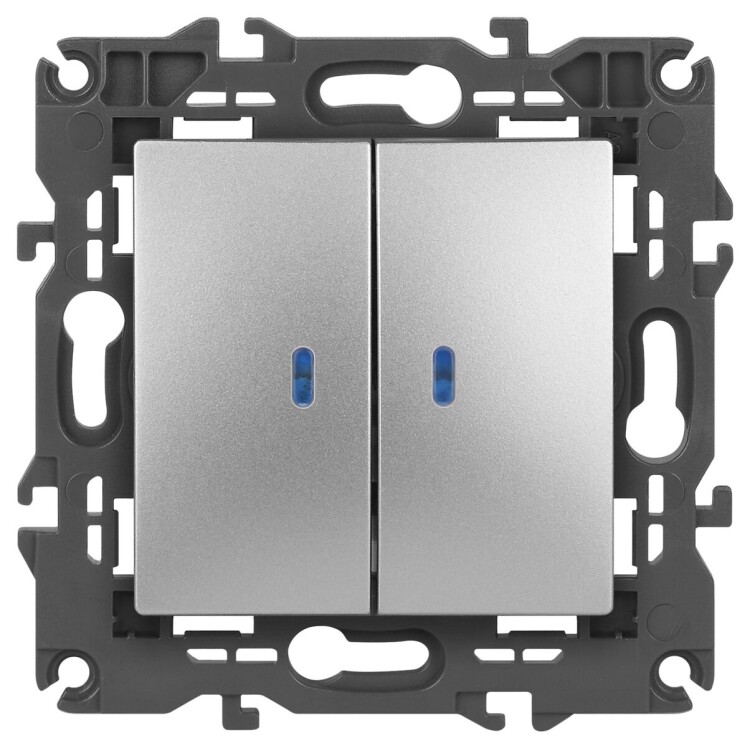 Выключатель 2-клавишный подсветка Эра Elegance алюминий 14-1105-03. Оснащён автоматическими клеммами для надёжной фиксации жил кабеля в механизме. Рамки приобретаются отдельно.
