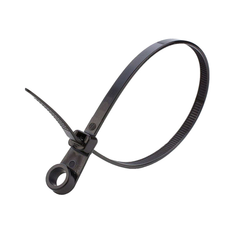 - Наличие монтажного отверстия на конце стяжки позволяет произвести быстрый монтаж хомута к рабочей поверхности с помощью саморезов или гвоздей.<br />