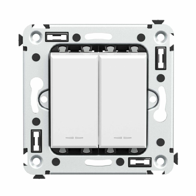 Инвертор двухклавишный. Назначение – для монтажа в подрозеточные коробки глубиной не менее 45 мм (код 59301). Служит для включения/выключения освещения с трех и более мест. Характеристики – 2 модуля, диаметр отверстий для ввода кабелей - 3 мм (по 2 отверстия на одну клемму), винтовые зажимы, фиксация в подрозеточную коробку при помощи саморезов, шаблон для зачистки кабеля - 11 мм, номинальный ток - 16 A, ном инальное напряжение - 230 В. Цвет – ""Белое облако"".