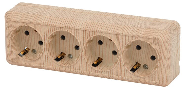<p>Розетка четырехместная серии Intro Quadro открытой установки цвет сосна 2-208-11. Номинальные характеристики 16А 250В. Выполнена из негорючего термопласта, оснащёна винтовыми зажимами.</p>