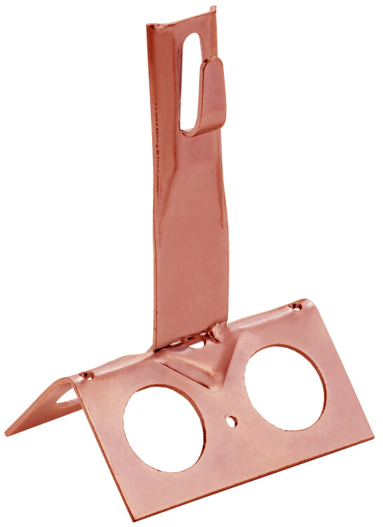 скатной кровли. Зажим проводника происходит путем загибания «язычка» держателя. На коньке крепится при помощи метизов. Материал корпуса - медь.