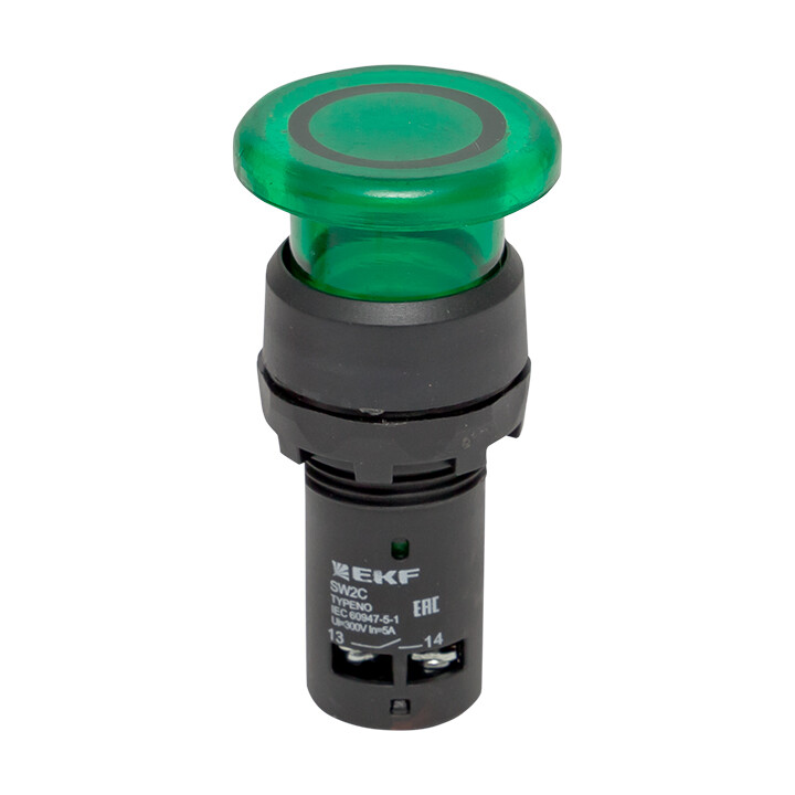 Кнопки типа Грибок применяются в электрических цепях переменного тока частотой 50/60 Гц с напряжением до 660 В и постоянным напряжением до 400 В. Исполнение такого типа ( активная часть выступает) позволяет простым нажатием быстро подать управляющий сигнал на оборудование. Включение кнопки облегчается за счет большой площади поверхности нажатия.
