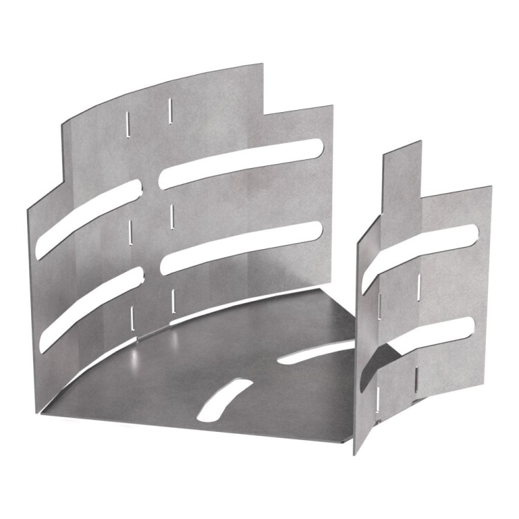 Аксессуары изготовленные из стали с защитным покрытием по методу Сендзимира – это изделия, на которых защитное цинковое покрытие было нанесено на листовую сталь перед изготовлением. Толщина защитного покрытия варьируется от 10 до 22мкм. Климатическое исполнение изделий УХЛ2, что предусматривают эксплуатацию в помещении и под навесом, при температуре эксплуатации от -80 до +150°С. Обеспечивает пла вный переход горизонтальной кабеленесущей линии между лотками металлическими в диапазоне от 0 до 45 градусов.
