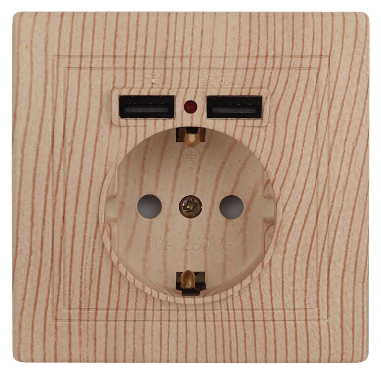 <p>Розетка 2P+E Schuko со шторками, 16А-250В + 2хUSB 5В-2,1А, IP20, СУ, сосна Intro Plano 1-410-11</p>