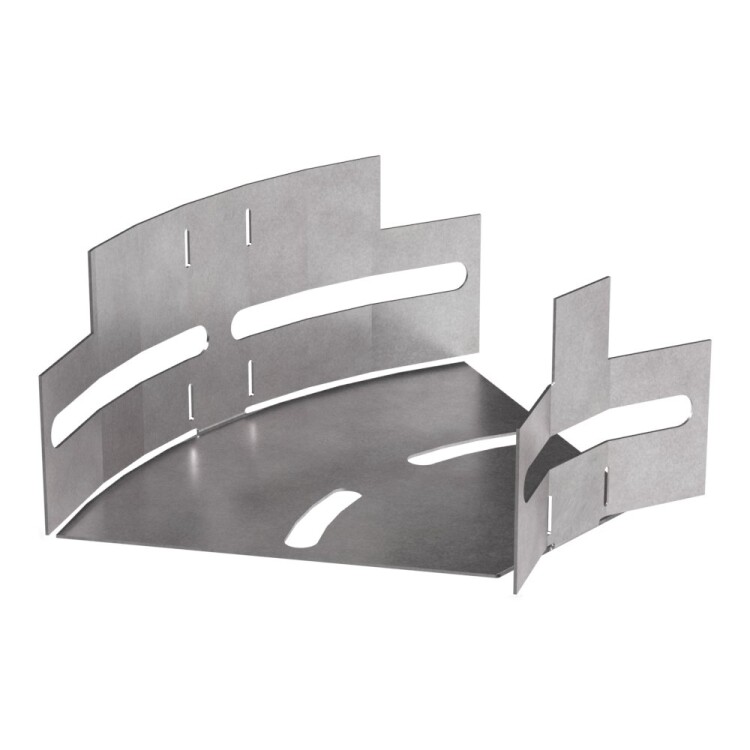 Аксессуары изготовленные из стали с защитным покрытием по методу Сендзимира – это изделия, на которых защитное цинковое покрытие было нанесено на листовую сталь перед изготовлением. Толщина защитного покрытия варьируется от 10 до 22мкм. Климатическое исполнение изделий УХЛ2, что предусматривают эксплуатацию в помещении и под навесом, при температуре эксплуатации от -80 до +150°С. Обеспечивает плавный переход горизонтальной кабеленесущей линии между лотками металлическими в диапазоне от 0 до 45 градусов.