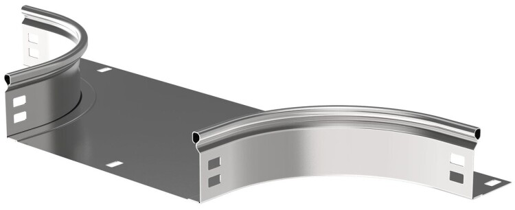 Отвод Т-образный плавный предназначен для организации Т- или Х-образного горизонтального отвода кабельной трассы. Также аксессуар применяется для Т-ответвления вниз в вертикальной плоскости без применения крышки. Крышка аксессуара в комплект не входит.
