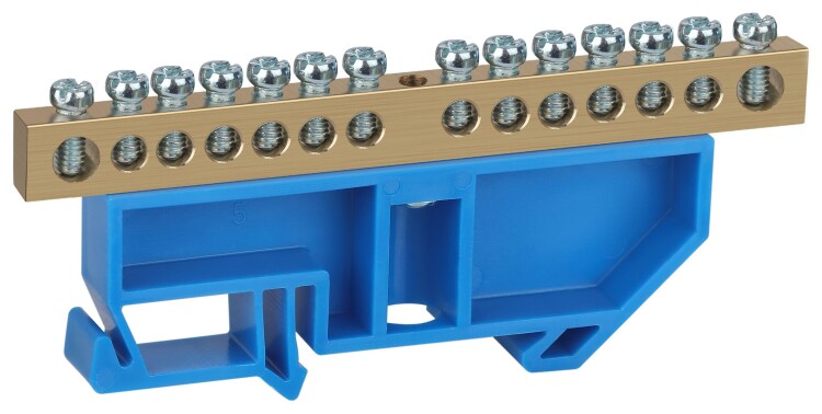 Изделие выполнено из латунной шины сечением 8?12 мм установленной на пластиковый DIN-изолятор синего цвета.<br />