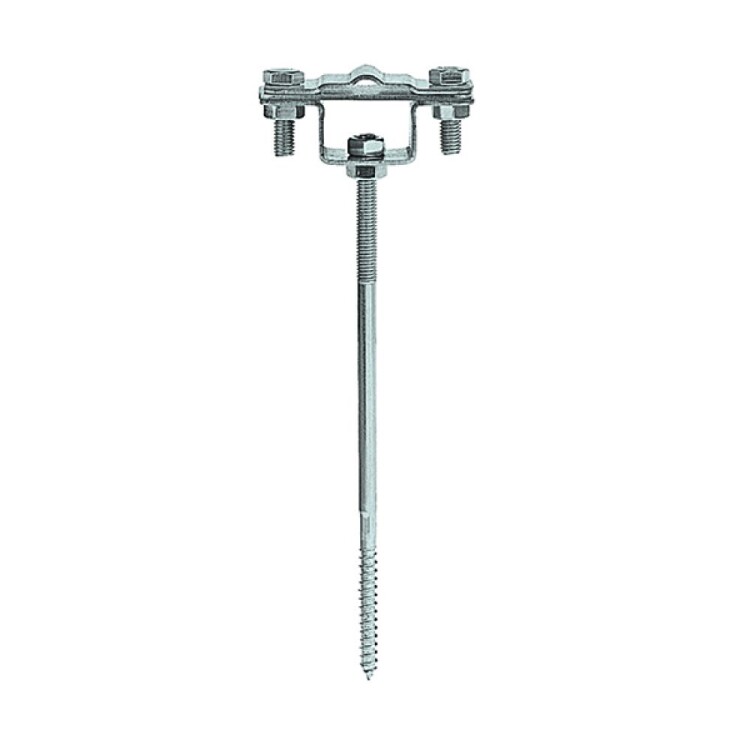 Держатель закрепляет пруток либо полосу токоотводов молниезащиты на деревянном фасаде. Изделие выполнено на основе держателя полоса/пруток, закрепленного на шпильке с резьбой по дереву. Проводник закрепляется при помощи держателя на расстоянии 120 мм от фасада.