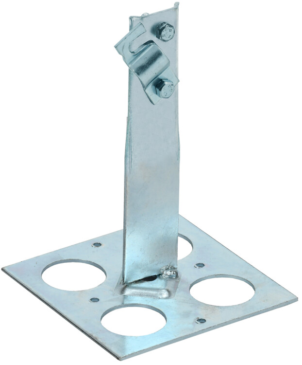 Держатель проводника круглого для плоской кровли с болтовым зажимом предназначен для закрепления прутка на плоской или наклонной кровле. Держатель крепится к кровле при помощи клея. Зажим проводника происходит при помощи болтового соединения. Материал корпуса - сталь горячеоцинкованная.