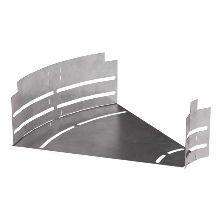 Аксессуары изготовленные из стали с защитным покрытием по методу Сендзимира – это изделия, на которых защитное цинковое покрытие было нанесено на листовую сталь перед изготовлением. Толщина защитного покрытия варьируется от 10 до 22мкм. Климатическое исполнение изделий УХЛ2, что предусматривают эксплуатацию в помещении и под навесом, при температуре эксплуатации от -80 до +150°С. Обеспечивает пла вный переход горизонтальной кабеленесущей линии между лотками металлическими в диапазоне от 0 до 45 градусов.