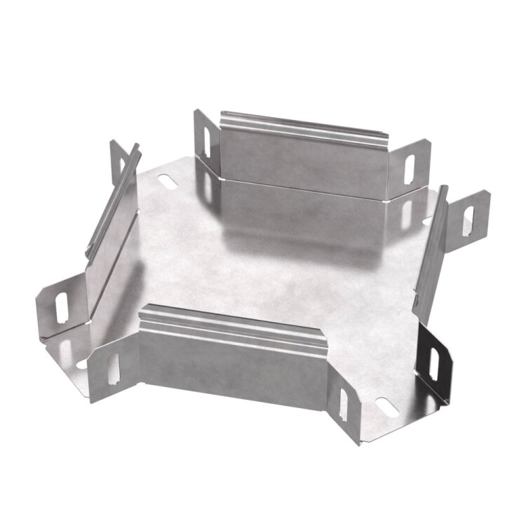 Аксессуары изготовленные из стали с защитным покрытием по методу Сендзимира – это изделия, на которых защитное цинковое покрытие было нанесено на листовую сталь перед изготовлением. Толщина защитного покрытия варьируется от 10 до 22мкм. Климатическое исполнение изделий УХЛ2, что предусматривают эксплуатацию в помещении и под навесом, при температуре эксплуатации от -80 до +150°С. Ответвитель X-обр азный предназначен для разветвления кабельных трасс в горизонтальном направлении, для перфорированных и глухих лотков. В комплект не входит крышка.