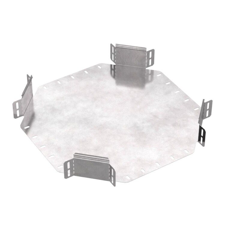 Аксессуары изготовленные из стали с защитным покрытием по методу Сендзимира – это изделия, на которых защитное цинковое покрытие было нанесено на листовую сталь перед изготовлением. Толщина защитного покрытия варьируется от 10 до 22мкм. Климатическое исполнение изделий УХЛ2, что предусматривают эксплуатацию в помещении и под навесом, при температуре эксплуатации от -80 до +150°С. Ответвитель X-обр азный предназначен для разветвления кабельных трасс в горизонтальном направлении, для перфорированных и глухих лотков. В комплект не входит крышка.