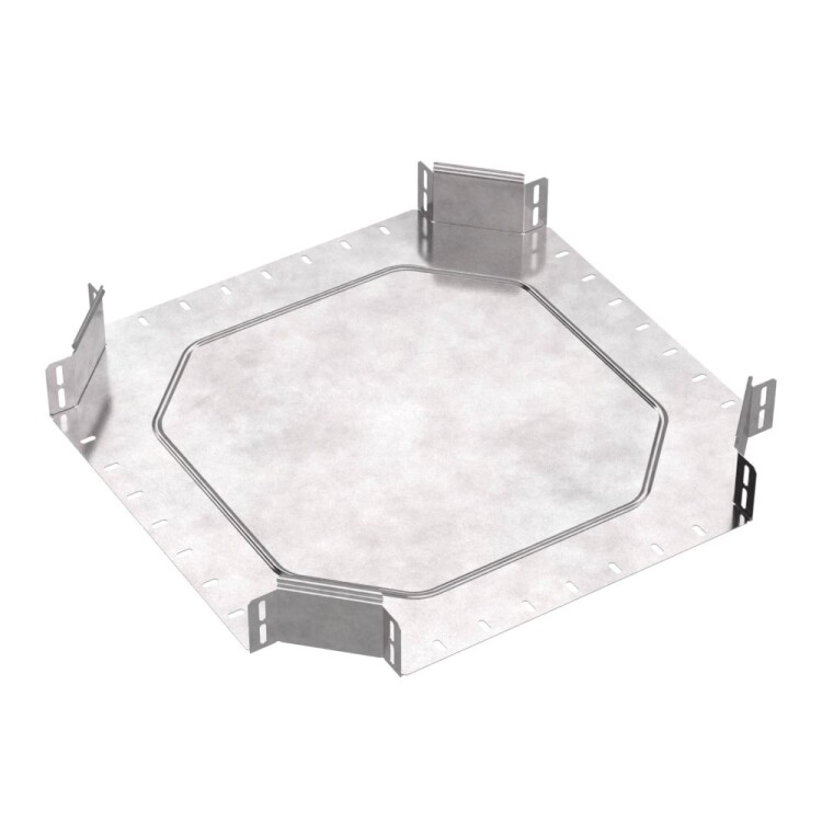 Аксессуары изготовленные из стали с защитным покрытием по методу Сендзимира – это изделия, на которых защитное цинковое покрытие было нанесено на листовую сталь перед изготовлением. Толщина защитного покрытия варьируется от 10 до 22мкм. Климатическое исполнение изделий УХЛ2, что предусматривают эксплуатацию в помещении и под навесом, при температуре эксплуатации от -80 до +150°С. Ответвитель X-обр азный предназначен для разветвления кабельных трасс в горизонтальном направлении, для перфорированных и глухих лотков. В комплект не входит крышка.