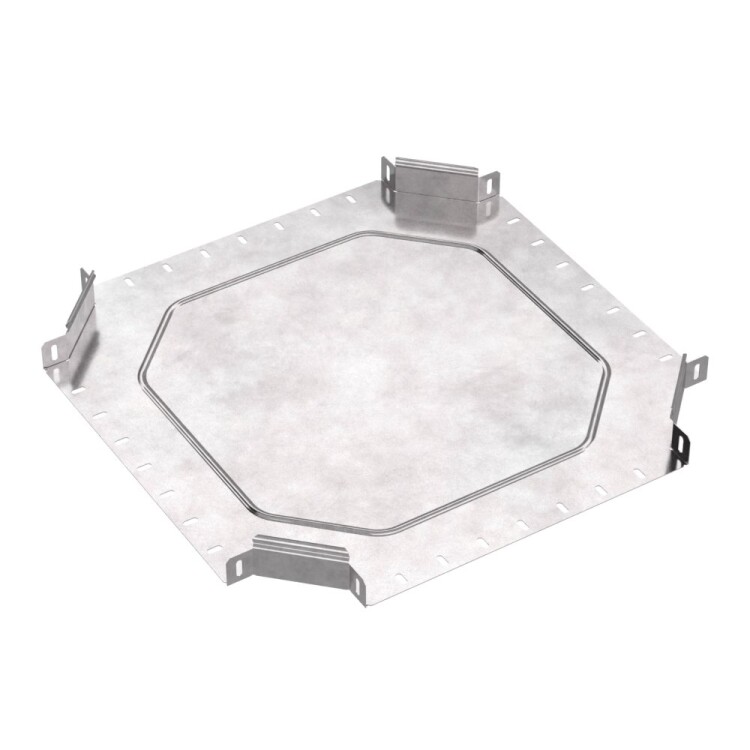 Аксессуары изготовленные из стали с защитным покрытием по методу Сендзимира – это изделия, на которых защитное цинковое покрытие было нанесено на листовую сталь перед изготовлением. Толщина защитного покрытия варьируется от 10 до 22мкм. Климатическое исполнение изделий УХЛ2, что предусматривают эксплуатацию в помещении и под навесом, при температуре эксплуатации от -80 до +150°С. Ответвитель X-обр азный предназначен для разветвления кабельных трасс в горизонтальном направлении, для перфорированных и глухих лотков. В комплект не входит крышка.