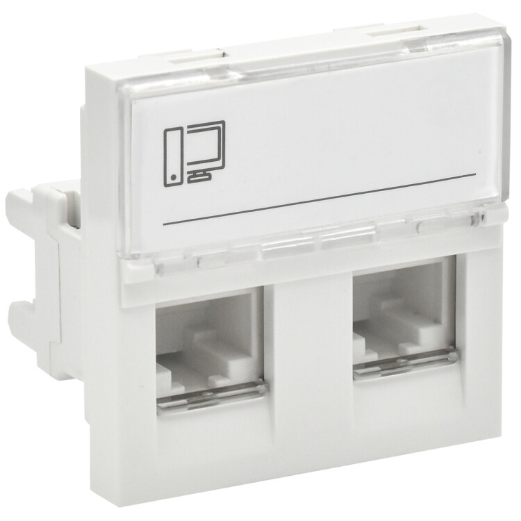 Модульные электроустановочные изделия 45х45 серии ПРАЙМЕР предназначены для организации рабочего места с применением кабель-каналов, напольных лючков или розеточных блоков, а также для открытого монтажа в коробки типа КМКУ. Розетка компьютерная RJ-45 предназначена для подключения сетевого кабеля компьютерной и прочей оргтехники. Розетка на 2 входа. Комплектуются одним модулем Keystone Jack категории 6 UTP IDC. Размеры, ВхШхГ,мм: 45х45х41,7. Цвет - белый. Размеры модульных ЭУИ ПРАЙМЕР: 1 модуль = 45х22,5 мм 2 модуля (1 пост) = 45х45 мм