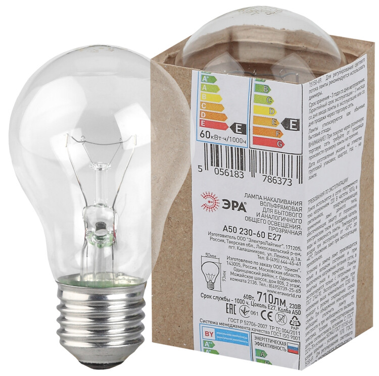 Лампочка ЭРА A50 60Вт Е27 / E27 230В груша прозрачная в гофре