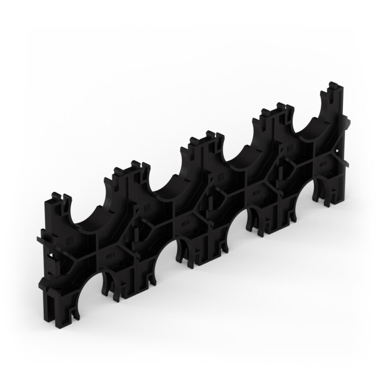 Кластеры для двустенных труб двухсторонние предназначены для упорядоченной прокладки двустенных гофрированных, жестких, дренажных и ливневых труб c фиксированным расстоянием между ними при блочном монтаже. С их помощью можно осуществлять монтаж на склонах с большим градусом уклона. С целью облегчения и ускорения групповой прокладки труб кластеры одного типоразмера теперь доступны к продаж е уже соединенные между собой по горизонтали.