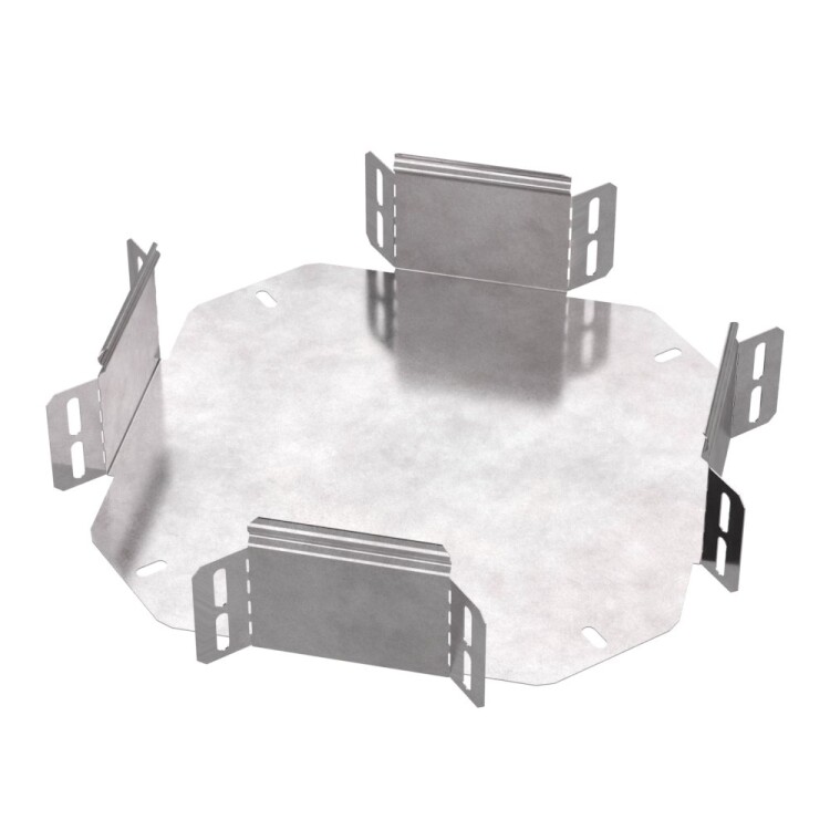 Аксессуары изготовленные из стали с защитным покрытием по методу Сендзимира – это изделия, на которых защитное цинковое покрытие было нанесено на листовую сталь перед изготовлением. Толщина защитного покрытия варьируется от 10 до 22мкм. Климатическое исполнение изделий УХЛ2, что предусматривают эксплуатацию в помещении и под навесом, при температуре эксплуатации от -80 до +150°С. Ответвитель X-обр азный предназначен для разветвления кабельных трасс в горизонтальном направлении, для перфорированных и глухих лотков. В комплект не входит крышка.