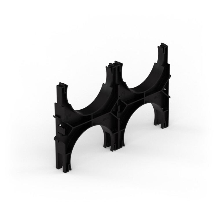 Кластеры для двустенных труб двухсторонние предназначены для упорядоченной прокладки двустенных гофрированных, жестких, дренажных и ливневых труб c фиксированным расстоянием между ними при блочном монтаже. С их помощью можно осуществлять монтаж на склонах с большим градусом уклона. С целью облегчения и ускорения групповой прокладки труб кластеры одного типоразмера теперь доступны к продаж е уже соединенные между собой по горизонтали.