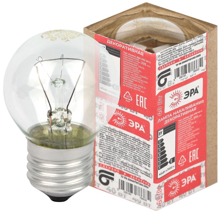 Лампочка ЭРА P45 40Вт Е27 / E27 230В шар прозрачный в гофре