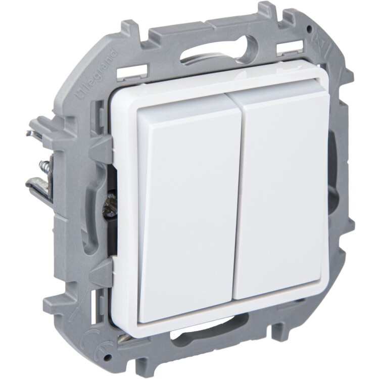 Переключатель модульный двухклавишный с подсветкой Inspiria для скрытого монтажа, цвет "Белый", номинальный ток 10 А, напряжение ~250В. Предназначен для установки в электрических сетях жилых и общественных зданий и используется для управления приборами освещения, вентиляции и т.д. Используется для независимой коммутации двух нагрузок. Подходит для управления с одного, двух или более мест. Оснащены дв умя лампами для подсветки или индикации.
