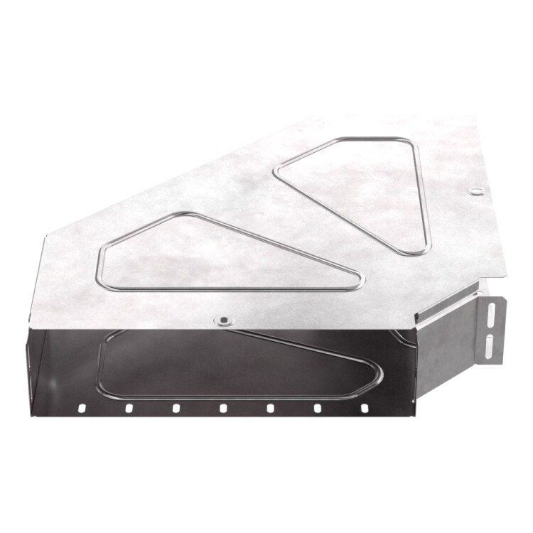 Аксессуары изготовленные из стали с защитным покрытием по методу Сендзимира – это изделия, на которых защитное цинковое покрытие было нанесено на листовую сталь перед изготовлением. Толщина защитного покрытия варьируется от 10 до 22мкм. Климатическое исполнение изделий УХЛ2, что предусматривают эксплуатацию в помещении и под навесом, при температуре эксплуатации от -80 до +150°С. Угол горизонталь ный 90 градусов предназначен для поворота кабельных трасс в горизонтальном направлении на 90 градусов, для перфорированных и глухих лотков. В комплект входит крышка.