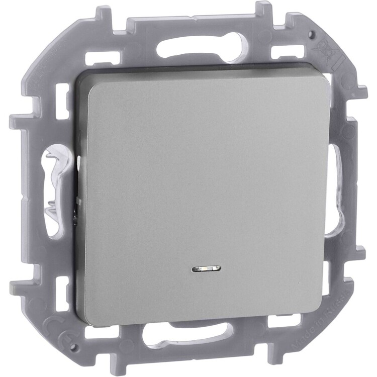 Выключатель одноклавишный с подсветкой/индикацией скрытого монтажа Inspiria, цвет "Алюминий", номинальный ток 10АХ, напряжение ~250В, безвинтовые зажимы. Устанавливается в жилых и общественных помещениях для управления приборами освещения, вентиляции и т.д.