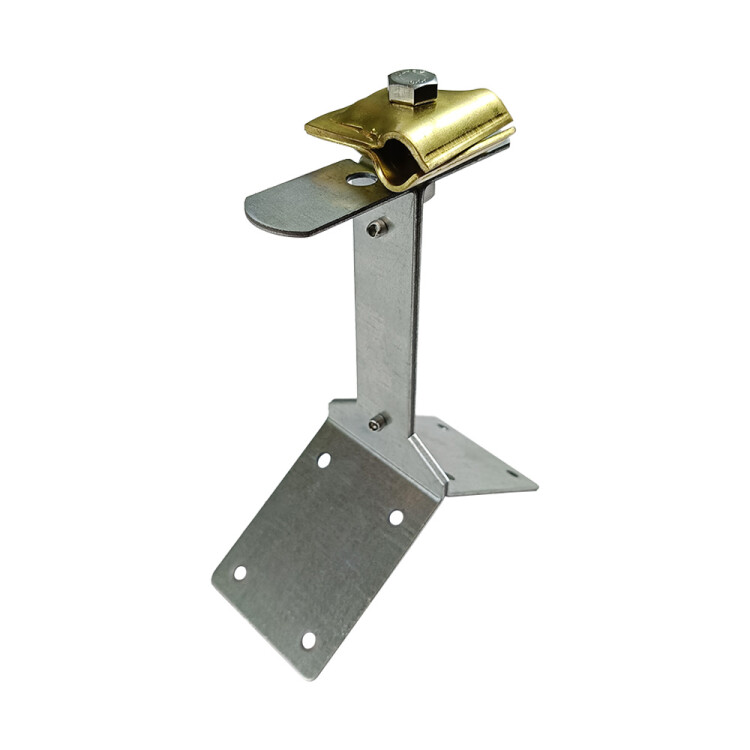 Держатель-зажим используется для фиксации прутка молниезащитной сетки на коньке двускатной кровли. Возможно соединение между собой проводников из двух разных металлов. Стальной оцинкованный, стальной омедненный или медный круг диаметром 8-10 мм закрепляется между двумя латунными пластинами в параллельном, Т-образном или произвольном направлении. Основание держателя выполнено из листовой оцинкованной стали. Латунный зажим соединен с основанием при помощи болта, гайки и гроверной шайбы М8. Для крепления на коньке держатель имеет четыре отверстия под винт (саморез) диаметром 5 мм. Подходит для проводников: пруток диаметром от 8 мм до 10 мм.