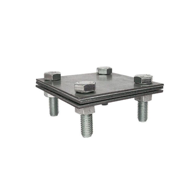Зажим заземления полоса/полоса крестообразный с пром. пластиной выполнен из оцинкованной стали и используется для соединения полосы с полосой Т-образным либо параллельным способом. Зажим стягивается при помощи четырех шестигранных болтов с
