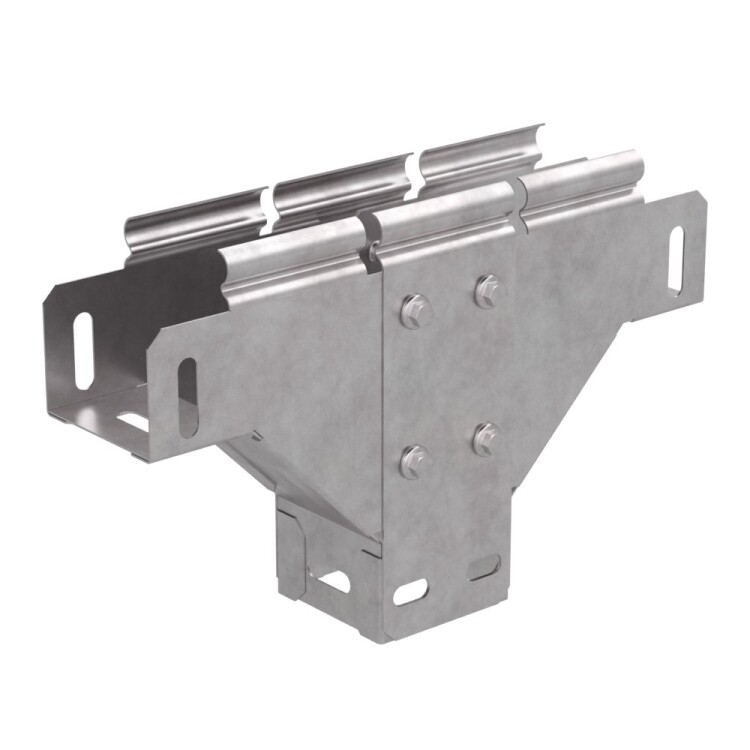 Аксессуары изготовленные из стали с защитным покрытием по методу Сендзимира – это изделия, на которых защитное цинковое покрытие было нанесено на листовую сталь перед изготовлением. Толщина защитного покрытия варьируется от 10 до 22мкм. Климатическое исполнение изделий УХЛ2, что предусматривают эксплуатацию в помещении и под навесом, при температуре эксплуатации от -80 до +150°С. Ответвитель Т-образный вертикальный применяется для обеспечения полноразмерного ответвления горизонтальной кабеленесущей системы из лотков металлических в вертикальном направлении.