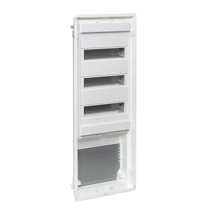 Корпуса пластиковые серии «Nova» предназначены для сборки силовых, слаботочных и комбинированных щитов. На DIN-рейки устанавливается модульное оборудование. На монтажные платы – антенные разветвители, Wi-Fi роутеры, патч-панели и иное слаботочное оборудование. Щиты устанавливаются как в бетонные и кирпичные стены, так и в гипсокартон, монтажные комплекты для установки в гипсокартон входят в комплектацию оснований щитов либо в комплектацию щитов в сборе. Двери щитов можно выбрать их разных материалов – пластик, металл или металл с перфорацией. Также доступны дополнительные аксессуары, необходимые для установки мультимедийного оборудования и существенно упрощающих монтаж щитов. Есть возможность приобрести как отдельно основание щита и дверь, так и основание с дверью в комплекте в одной коробке. Основные преимущества: съемные шасси с din-рейками, съемные кабельные фланцы, гребенка для фиксации входящих проводников, регулировка дверей по глубине, современный минималистичный дизайн
