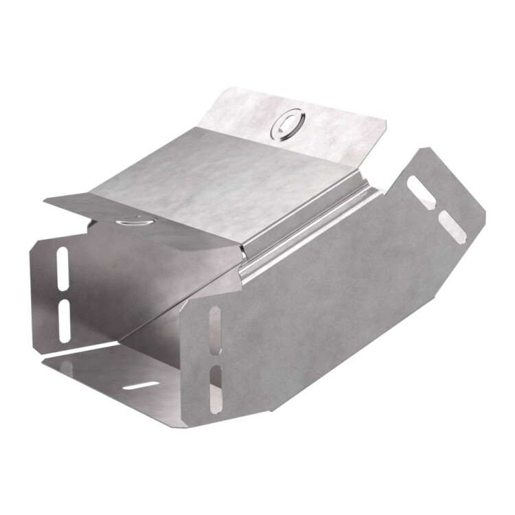 Аксессуары изготовленные из стали с защитным покрытием по методу Сендзимира – это изделия, на которых защитное цинковое покрытие было нанесено на листовую сталь перед изготовлением. Толщина защитного покрытия варьируется от 10 до 22мкм. Климатическое исполнение изделий УХЛ2, что предусматривают эксплуатацию в помещении и под навесом, при температуре эксплуатации от -80 до +150°С. Угол вертикальный внутренний 45 градусов предназначен для подъема кабельных трасс на 45 градусов, для перфорированных и глухих лотков. В комплект входит крышка.