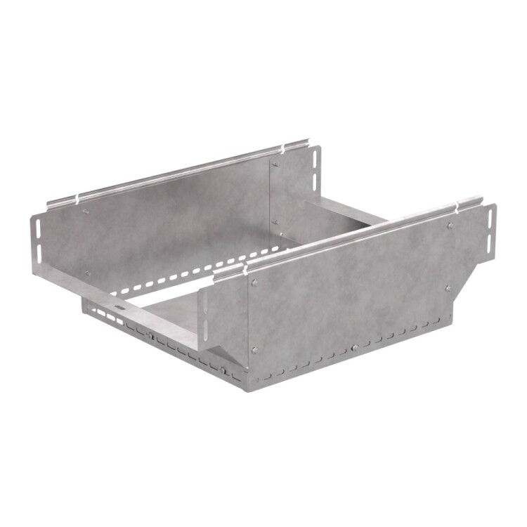 Аксессуары изготовленные из стали с защитным покрытием по методу Сендзимира – это изделия, на которых защитное цинковое покрытие было нанесено на листовую сталь перед изготовлением. Толщина защитного покрытия варьируется от 10 до 22мкм. Климатическое исполнение изделий УХЛ2, что предусматривают эксплуатацию в помещении и под навесом, при температуре эксплуатации от -80 до +150°С. Ответвитель Т-образный вертикальный применяется для обеспечения полноразмерного ответвления горизонтальной кабеленесущей системы из лотков металлических в вертикальном направлении.