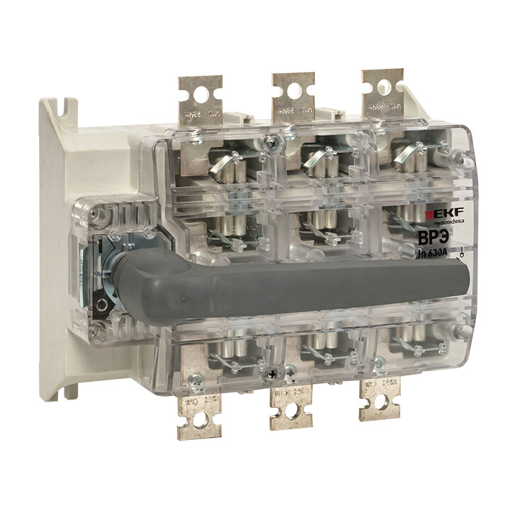 Выключатели-разъединители ВРЭ EKF PROxima предназначены для ручного включения-отключения цепей переменного тока номинальным напряжением до 500 В / 690 В (ВРЭ/ВРЭ с предохранителями) частотой 50 Гц, а также для защиты от коротких замыканий и перегрузки в моделях с плавкими предохранителями (предохранители в комплект поставки не включены). Двойной видимый разрыв цепи и прочный корпус с функцией дугогасительной камеры, выполненный из негорючего полиамида со стекловолокном, обеспечивают максимальную безопасность переключения. Фронтальная защита от прикосновений обеспечивается защитной крышкой. Применяются в качестве аварийного или главного выключателя для токов от 160 до 630 А во вводно-распределительных устройствах, распределительных и шкафах управления и др. Устанавливаются на монтажную панель. Конструктивно ВРЭ EKF PROxima состоит из трехполюсного основания с механизмом замыкания/размыкания контактов и дугогасительными камерами, прозрачной защитной крышки для визуального определения положения контактов и рукоятки. Конструкция контактных выводов обеспечивает болтовое присоединение шин или проводников, оконцованных кабельными наконечниками. Есть возможность установки замка для блокировки включения/отключения. Выключатели-разъединители ВРЭ EKF PROxima поставляются с передней рукояткой с возможностью выноса ее на дверцу шкафа. Выключатели могут дополнительно оснащаться электромеханическим дополнительным контактом состояния NO + NC.
