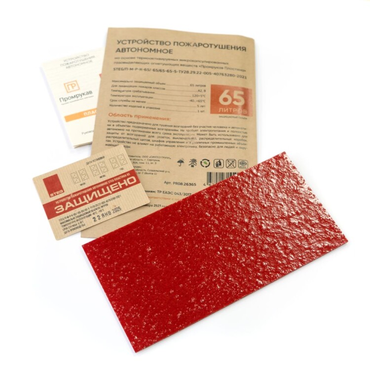 Автономное устройство пожаротушения "STEG Пластина" Промрукав состоит из термоактивируемых микрокапсул с газовым огнетушащим веществом (ФК-5-1-12), заключенных в газопроницаемую полимерную матрицу, и клеящего слоя для крепления пластин. Малые габариты Пластин позволяют установить их в местах наиболее близких к очагу возможного возгорания (подрозетники, контактные группы, скопление проводов, электрооборудование, щитовое оборудование и пр.), предотвращая возникновение и развитие пожара на ранней стадии в объемах до 65 литров. При пламенном воздействии или нагреве Пластин до температуры срабатывания (+120 °C), микрокапсулы разрушаются и импульсно выделяют газовое огнетушащее вещество, которое сбивает пламя, обрывает кинетические цепи процесса горения, создавая среду, не поддерживающую горение, и моментально прекращает пожар в защищаемом объеме.Противопожарная пластина Промрукав рассчитана на объем до 65 литров и имеет размеры 200х100х2,5 мм.