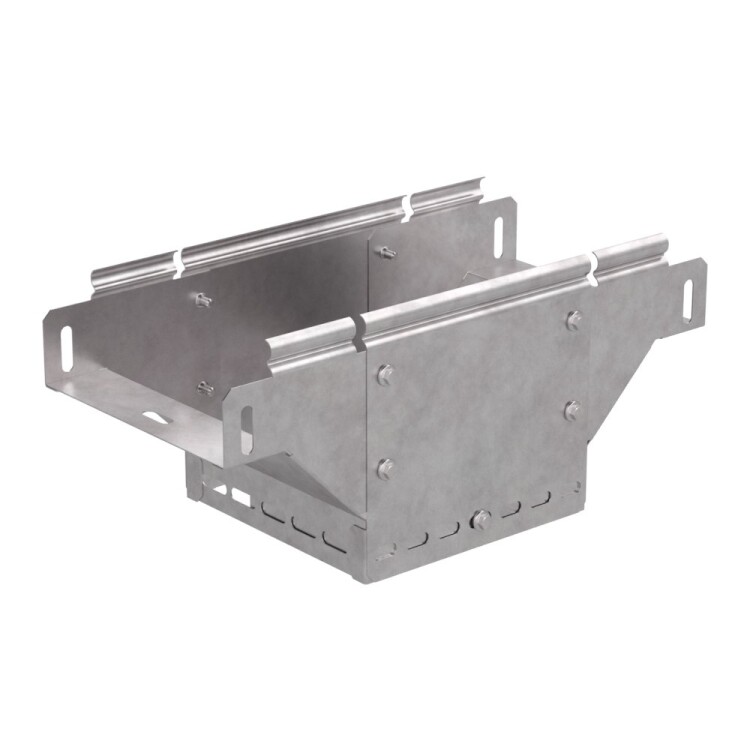 Аксессуары изготовленные из стали с защитным покрытием по методу Сендзимира – это изделия, на которых защитное цинковое покрытие было нанесено на листовую сталь перед изготовлением. Толщина защитного покрытия варьируется от 10 до 22мкм. Климатическое исполнение изделий УХЛ2, что предусматривают эксплуатацию в помещении и под навесом, при температуре эксплуатации от -80 до +150°С. Ответвитель Т-образный вертикальный применяется для обеспечения полноразмерного ответвления горизонтальной кабеленесущей системы из лотков металлических в вертикальном направлении.