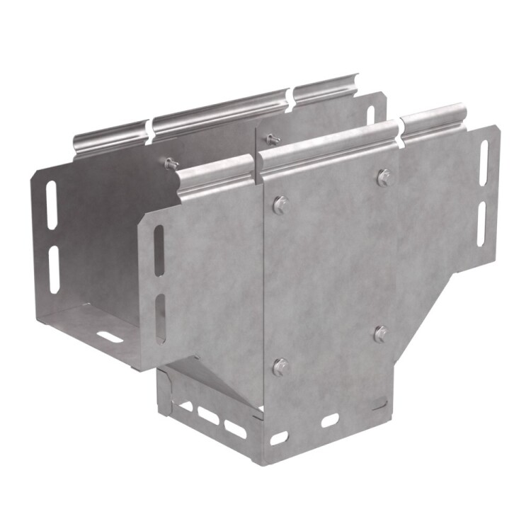Аксессуары изготовленные из стали с защитным покрытием по методу Сендзимира – это изделия, на которых защитное цинковое покрытие было нанесено на листовую сталь перед изготовлением. Толщина защитного покрытия варьируется от 10 до 22мкм. Климатическое исполнение изделий УХЛ2, что предусматривают эксплуатацию в помещении и под навесом, при температуре эксплуатации от -80 до +150°С. Ответвитель Т-образный вертикальный применяется для обеспечения полноразмерного ответвления горизонтальной кабеленесущей системы из лотков металлических в вертикальном направлении.