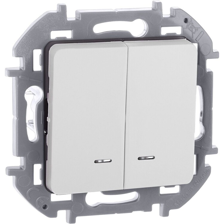 Выключатель двухклавишный с подсветкой/индикацией скрытого монтажа Inspiria, цвет "Белый", номинальный ток 10АХ, напряжение ~250В, безвинтовые зажимы. Устанавливается в жилых и общественных помещениях для управления приборами освещения, вентиляции и т.д. Предназначен для управления двумя электрическими цепями.